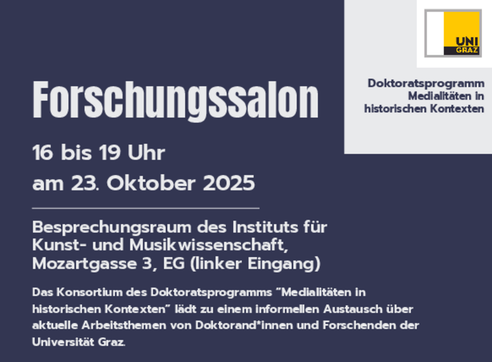 Das Konsortium des Doktoratsprogramms “Medialitäten in historischen Kontexten” lädt zu einem informellen Austausch über aktuelle Arbeitsthemen von Doktorand*innen und Forschenden der Universität Graz.